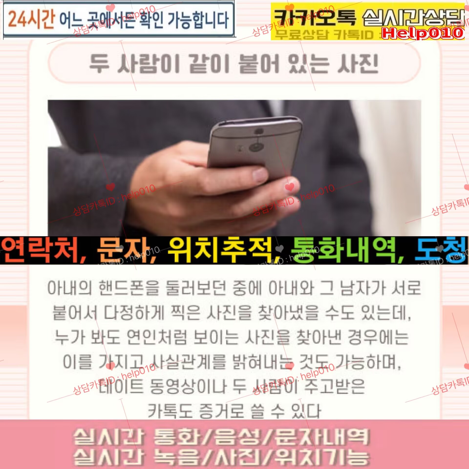 남편카톡해킹방법카톡ID:help010외도증거수집/위치추적도청/복제폰/쌍둥이폰/인스타해킹.문자통화내역조회/배우자카톡확인 스마트폰흥신소 통화내용청취.주변영상확인※문자발신추적.스파이앱팝니다/삭제된카톡조회