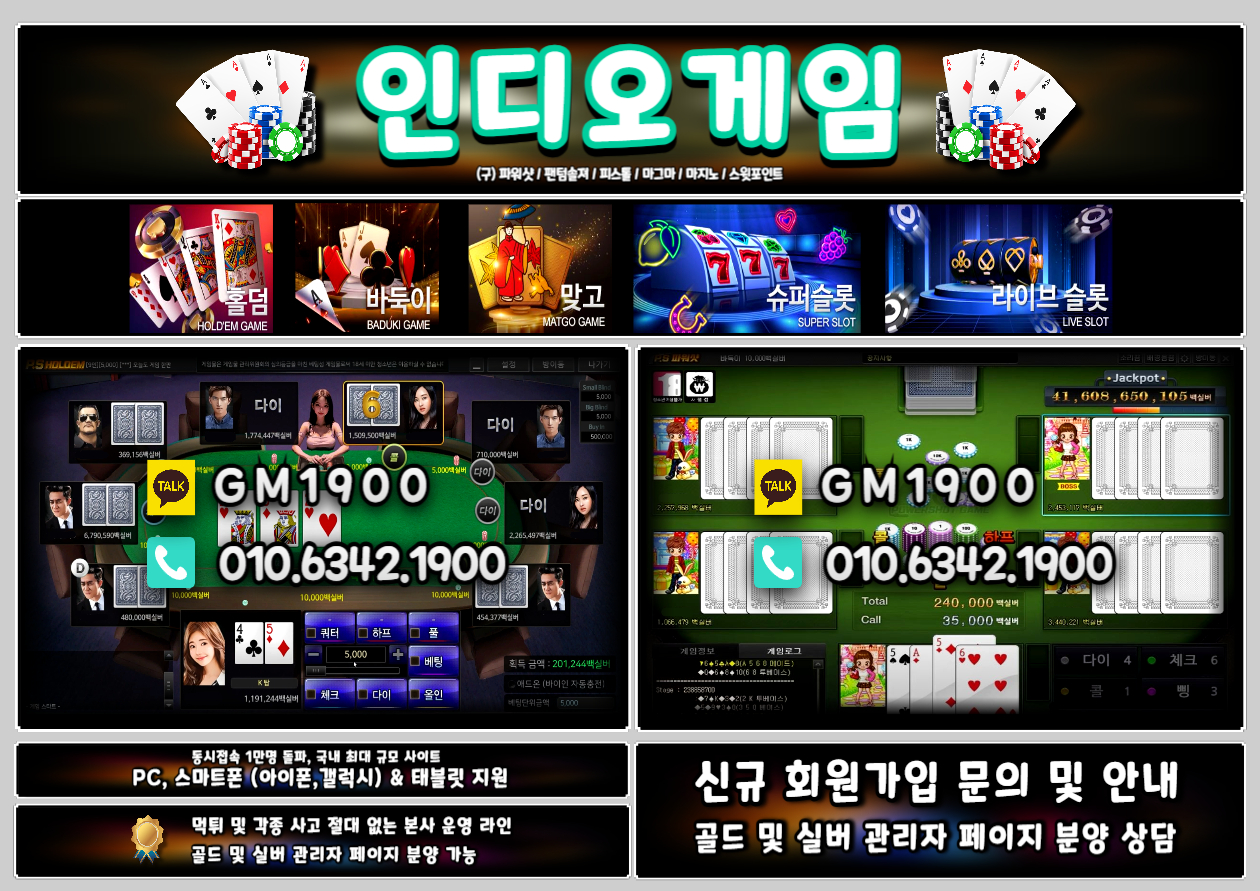 인디오게임 신규 회원 가입 / 인디오게임 이용 문의 / 인디오게임 골드 & 실버 관리자 페이지 분양 상담 24시 콜 센터 : 0I0.6342.1900