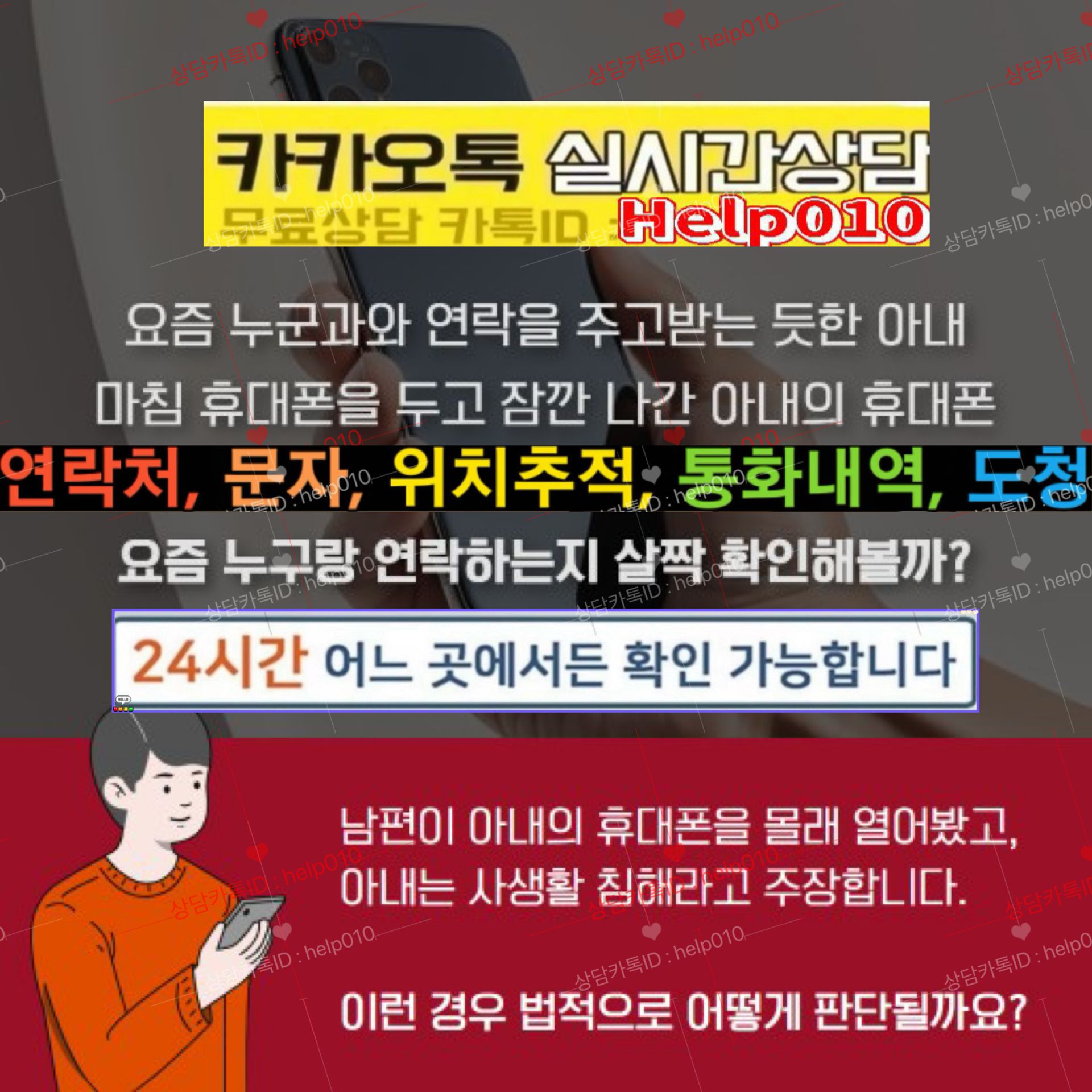 배우자핸드폰도청#휴대폰복제#⭐카톡ID:Help010⭐복제폰#쌍둥이폰#위치추적#카톡해킹#스마트폰해킹#바람난배우자#이혼소송#외도증거수집#카톡내용확인#통화내역확인#문자및메신저확인#사진동영상확인#통화녹음#결제내역및영수증조회#핸드폰백업및데이터복구#스파이앱 등 다양한 기능들로 배우자 핸드폰의 모든것을 실시간 확인해보세요.